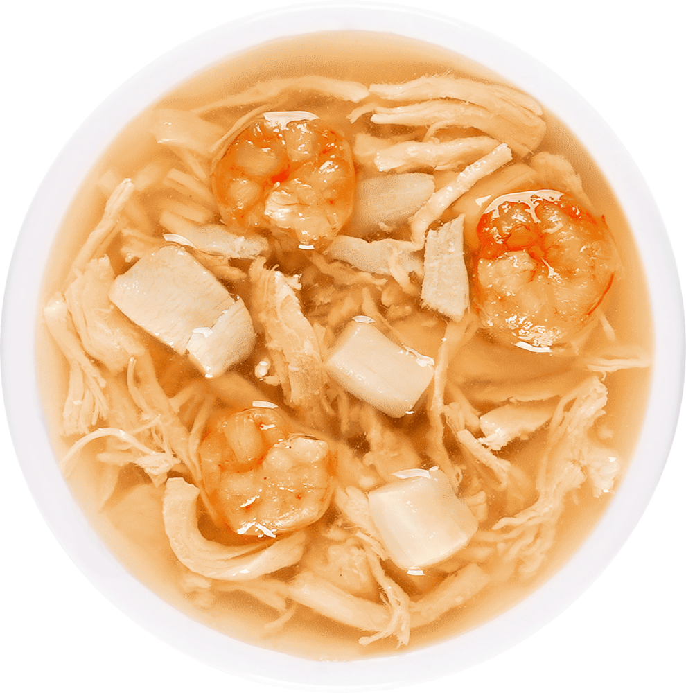 Состав: куриный бульон — 71,3%, курица — 20%, креветка — 4%, гребешок — 4%, желирующая добавка, экстракт тунца, витамин Е, таурин.nПищевая ценность, %: протеин — 10; жир — 0,2; клетчатка — 1; зола — 1,5; влажность — 89.nЭнергетическая ценность на 100 г — 30,8 ккал.