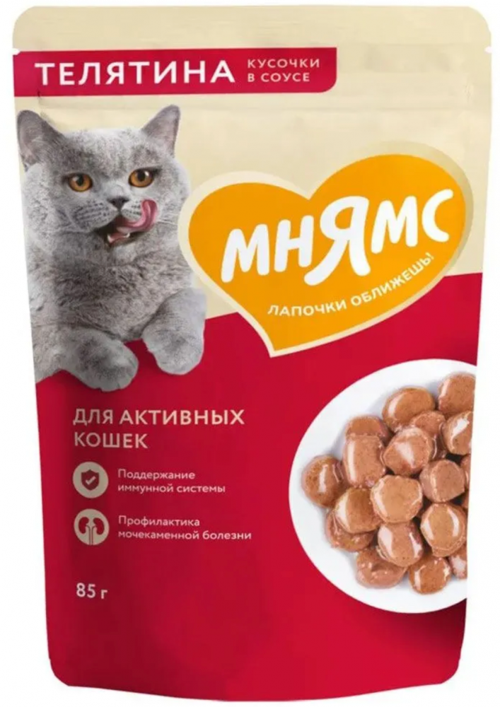 Влажный корм Мнямс Кусочки в соусе с телятиной для активных кошек 85г