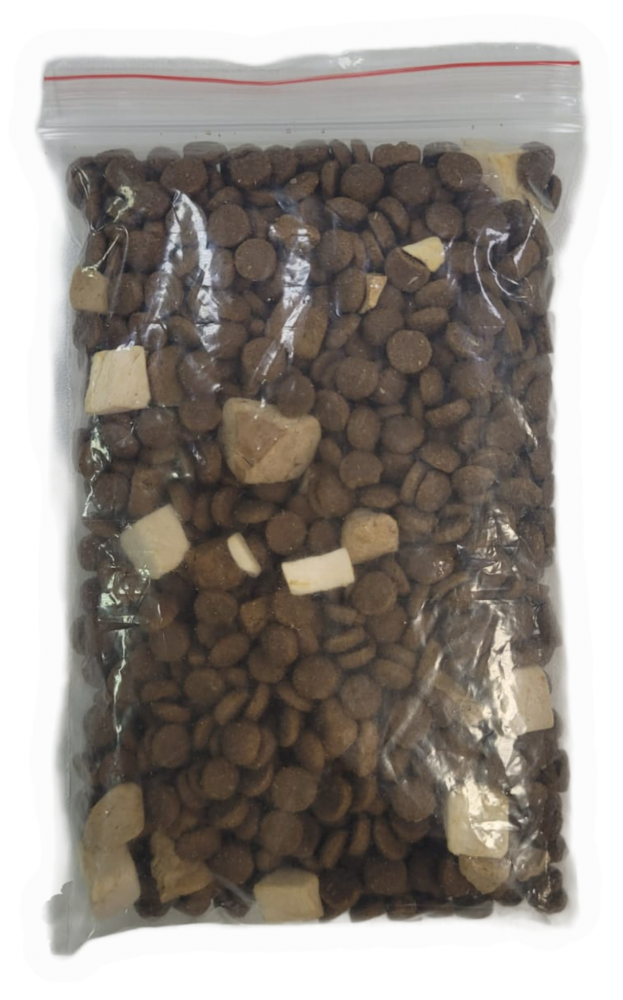 Гарантированный анализ: сырой белок 35,0%, сырой жир 12,0%, сырая клетчатка 3,5%, сырая зола 7,8%, влага 10,0%, кальций 0,8%, фосфор 0,6%, натрий 0,9%, магний 0,04%.