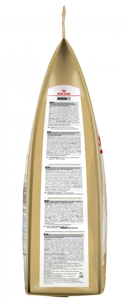 Корм для кошек породы сфинкс представляет собой сбалансированный по пищевой и энергетической ценности продукт. Он ориентирован на повышенную потребность породы в энергии из-за отсутствия шерсти. В состав входят витамины и минералы, которые предотвращают появление различных заболеваний пищевой системы, а также сердца. В состав корма включены вещества, дающие много энергии и защищающие кожу кошки от внешних воздействий. Состав:Дегидратированное мясо птицы, животные жиры, рис, изолят растительных белков*, кукуруза, растительная клетчатка, дегидратированные белки животного происхождения (свинина)*, гидролизат белков животного происхождения, пшеница, кукурузная клейковина, свекольный жом, минеральные вещества, дрожжи, рыбий жир, томаты (источник ликопина), соевое масло, фруктоолигосахариды, гидролизат дрожжей (источник мaннановых олигосахаридов), масло огуречника аптечного, экстракт бархатцев прямостоячих (источник лютеина). Добавки (в 1 кг)*: Питательные добавки: витамин A: 29800 МЕ, витамин D3: 800 МЕ, E1 (железо): 38 мг, E2 (йод): 3,8 мг, E4 (медь): 5 мг, E5 (марганец): 50 мг, E6 (цинк): 149 мг, E8 (селен): 0,08 мг, L-карнитин: 50 мг, таурин: 2,9 г; консерванты, антиоксиданты. Подробнее