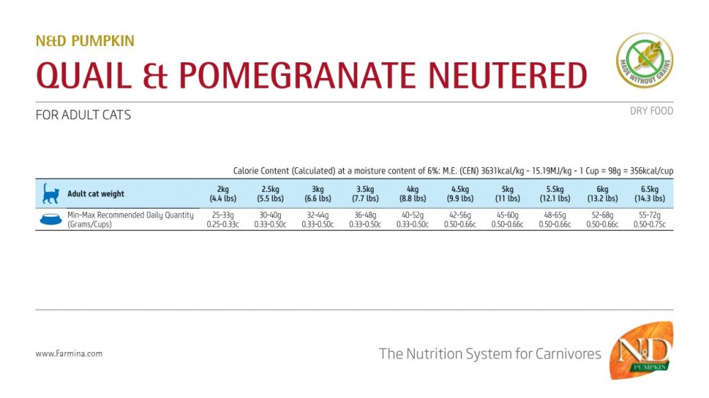 Питательные вещества: сырой белок — 46,0%; сырые жиры и масла — 11,0%; сырая клетчатка — 5,50%; влага — не более 9,00%; сырая зола — 8,70%; кальций — 1,50%; фосфор — 1,30%; Омега-6 — 2,00%; Омега-3 — 0,45%; докозагексаеновая кислота (DHA) — 0,30%; эйкозапентаеновая кислота (EPA) — 0,10%; глюкозамин — 1200мг/кг; хондроитин — 900мг/кг. Ингредиенты: свежее мясо перепела (32%), дегидратированное мясо перепела (30%), гороховый крахмал, дегидратированная тыква (5%), дегидратированные цельные яйца, куриный жир, свежая сельдь, дегидратированная сельдь, гидролизат рыбного белка, рыбий жир, сушеная морковь, сушеная люцерна, инулин, фруктоолигосахариды, маннанолигосахариды (дрожжевой экстракт), сушеный гранат (0,5%), сушеные яблоки, сушеный шпинат, подорожник (0,3%), сушеная черная смородина, дегидратированный сладкий апельсин, сушеная черника, хлорид натрия, сухие пивные дрожжи, куркума (0,2%), глюкозамин, хондроитин сульфат, экстракт календулы (источник лютеина). Пищевые добавки на 1 кг: Витамин А — 18000МЕ; Витамин D3 — 1200МЕ; Витамин Е — 600мг, Витамин С — 300мг; Никотиновая кислота — 150мг; Пантотеновая кислота — 50мг; Витамин В2 — 20мг; Витамин В6 — 8,1мг; Витамин В1 — 10мг; Витамин Н — 1,5мг; Фолиевая кислота — 1,5мг; Витамин В12 — 0,1мг; Холина хлорид — 2500мг; Бета-каротин — 1,5мг; Хелат цинка аналогичный метионин гидроксилазе — 910мг; Хелат марганца аналогичный метионин гидроксилазе — 380мг; Хелат железа гидрата глицина — 250мг; Хелат меди аналогичный метионин гидроксилазе — 88мг; Обогащенные селеном инактивированные дрожжи — 0,40мг; DL-метионин — 5000мг; Таурин — 4000мг. Специальные добавки: экстракт алоэ вера — 1000мг; экстракт зеленого чая — 100мг; экстракт розмарина. Антиоксиданты: экстракт токоферолов натурального происхождения. Рекомендации по кормлению: Нормы кормления указаны в таблице на упаковке. При переводе на N&D рекомендуется постепенно замещать предыдущий корм на новый. Хранить в прохладном, сухом месте. Произведено за 18 месяцев до окончания срока годности, указанного на упаковке. Производится из ингредиентов преимущественно из Италии, Дании и Франции. Масса нетто, срок годности, номер партии и регистрационный номер завода указаны на упаковке. Подробнее