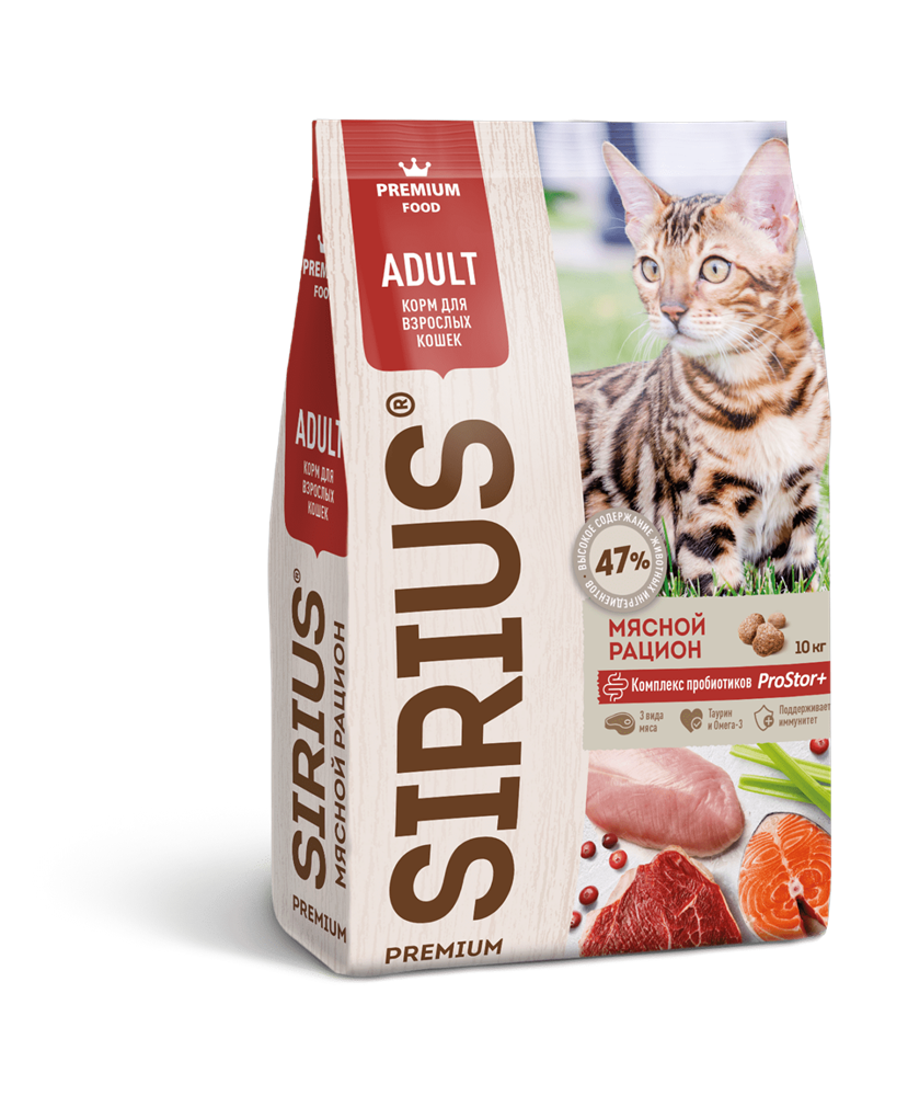 Отличие корма премиум класса SIRIUS "Мясной рацион" для взрослых кошек от аналогов: