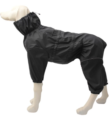 Благодаря высокому воротнику и регулировке по линиям шеи и талии костюм-дождевик садится "по фигуре" питомца и не стесняет его движений во время прогулки. Изделие надежно фиксируется при помощи молнии на боку и двух эластичных пряжек, а на штанинах предусмотрены удобные резинки, препятствующие попаданию грязи или налипанию снега снизу.