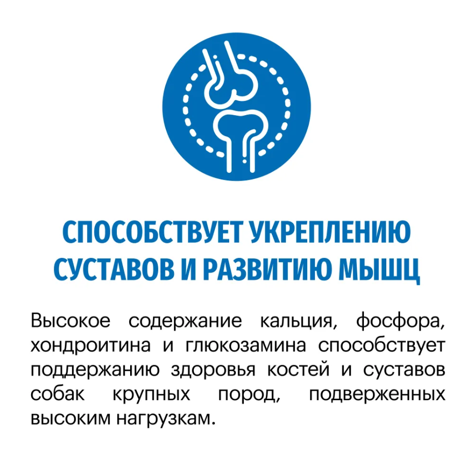 Способствует укреплению суставов и поддержанию здоровья костей Высокое содержание кальция, фосфора, хондроитина и глюкозамина способствует поддержанию здоровья костей и суставов собак крупных пород, подверженных высоким нагрузкам. Специально подобранные питательные вещества, минеральные элементы и витамины Способствуют улучшению работы пищеварительной системы, что позволяет вашей собаке оставаться сильной, активной и здоровой Поддерживает здоровье кожи и шерсти собаки Сбалансированное содержание омега-3 и омега-6 жирных кислот способствует поддержанию здоровья кожи и шерсти. Состав Дегидрированное мясо (в т.ч. индейка), цельные злаки, животный жир (в т.ч. лососевый, консервированный витамином E), растительная клетчатка, гидролизованные мясные белки, пивные дрожжи (источник маннанолигосахаридов), витаминно-минеральный комплекс, комплекс для суставов (глюкозамин, хондроитин), морская капуста, сушеное яблоко. Сохранено витамином С и природным токоферолом (источник натурального витамина Е). Пищевая ценность Протеин - 26%, жир - 14%, влажность - не более 9%, зола - 7,5%, клетчатка - 3%, омега-6 - 2,6%, лизин - 1,5%, кальций - 1,3%, фосфор - 0,9%, метионин и цистин - 0,7%, калий - 0,6%, натрий - 0,3%, омега-3 - 0,22%, триптофан - 0,2%. Витамины и минералы Витамин А - 12000 МЕ, витамин D3 - 1000 МЕ, витамин Е - 200 МЕ, витамины группы В (В1 - 5 мг, В2 - 6 мг, В3 - 15 мг, В4 - 1000 мг, В5 - 15 мг, В6 - 6 мг, В7 - 0,5 мг, В9 - 1 мг, В12 - 0,04 мг), цинк - 125 мг, железо - 60 мг, витамин С - 50 мг, медь - 10,5 мг, марганец - 10,5 мг, йод - 1 мг, селен - 0,95 мг. Энергетическая ценность 3750 ккал/кг Подробнее