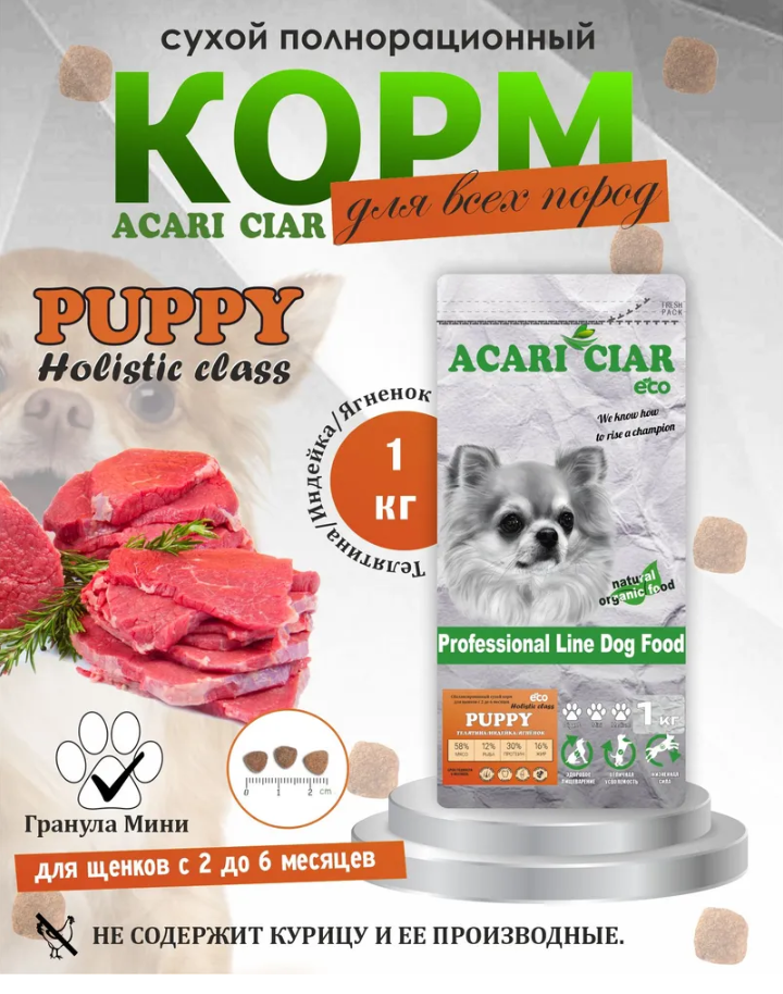 Корм Acari Ciar обеспечит животное крепким здоровьем и отличным самочувствием на долгие годы. Высокое содержание белков животного происхождения легко усваиваются и хорошо перевариваются в организме собак. А безопасная технология производства сохраняет все полезные свойства. Не содержит: Сои, ГМО, красителей и усилителей вкуса, картофеля, искусственных антиоксидантов и консервантов, гормонов и антибиотиков Состав Мясо индейки 10% Мясо телятины 8% Мясной сбор говяжий (мясная обрезь, сердце и почки) 5% Мясо рыб лососевых пород 6% Дегидрированнае мясо индейки высшего сорта 6% Дегидрированное мясо телятины высшего сорта 6% Дегидрированное мясо лососевых пород высшего сорта 6% Сухое цельное яйцо Рис Кубанский Овсянка (геркулес) Пшено мелкого помола Пшеничные волокна Масло лосося, нерафинированное подсолнечное масло холодного отжима, Жир говяжий и индейки (в качестве консерванта используется Вит.E) Натуральный хрящ КРС (источник хондроитина и глюкозамина) Мука тонкого и грубого помола из овощных и др. растительных культур (источник клетчатки) Томаты, шпинат, морковь, петрушка, листья салата, крыжовник, яблоко. Витаминно-минеральный комплекс (фито-кальцевит для щенков Mealberry) Экстракт бархатцев прямостоячих (источник лютеина) Экстракт цикория (натуральный пребиотик и источник инулина) Пивные дрожжи (естественный источник MOS) L-карнитин, Семя льна, Кора дуба, Расторопша, Свекольный жом, Юкка Шидигера, Мико Карб. Витамины и минералы Витамин А: 15000МЕ, Витамин D: 15000МЕ,Витамин Е: 50МЕ, Витамин В1: 3мг, Витамин В2: 5мг, Витамин В4: 180мг, Витамин В6: 2мг, Витамин В12: 100мкг, Биотин 100 мкг, Никотиновая кислота 15мкг, Фоливая кислота 2мг, Калий 1,35г, Магний 250мг, Сера 630мг,Железо 120мг, Йод 1,2мг, Медь 1,0мг, Марганец 10мг, Цинк 18мг, Селен 12мг/кг, Кремний 15мг, Фтор 0,3мг. Содержание питательных веществ Белок -30%, Жир-16%, Клетчатка-3%, Зола-6%, Кальций-1 %, Фосфор-0,8%, Омега369-3,31%,Влажность-9,5% Подробнее