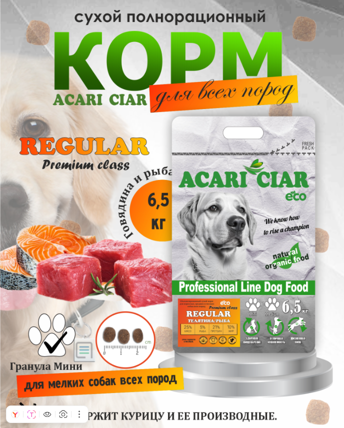 Корм Акари Киар РЕГУЛЯР МИНИ Говядина+суб подукты для собак 6,5 кг