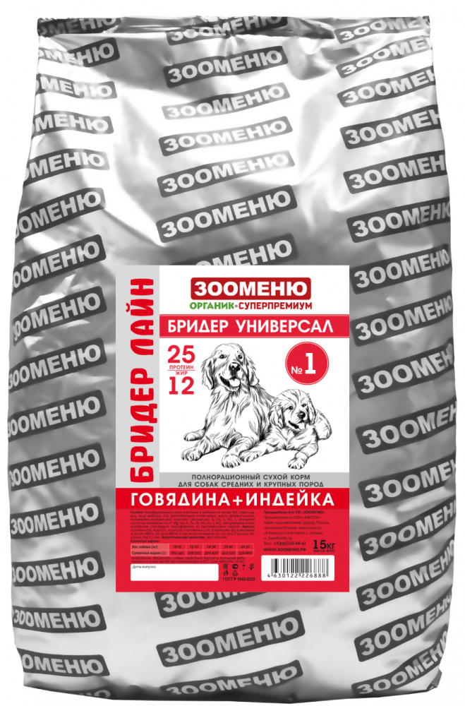 Корм Зооменю Бридер Лайн УНИВЕРСАЛ Говядина+индейка 15 кг для собак