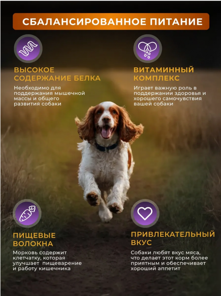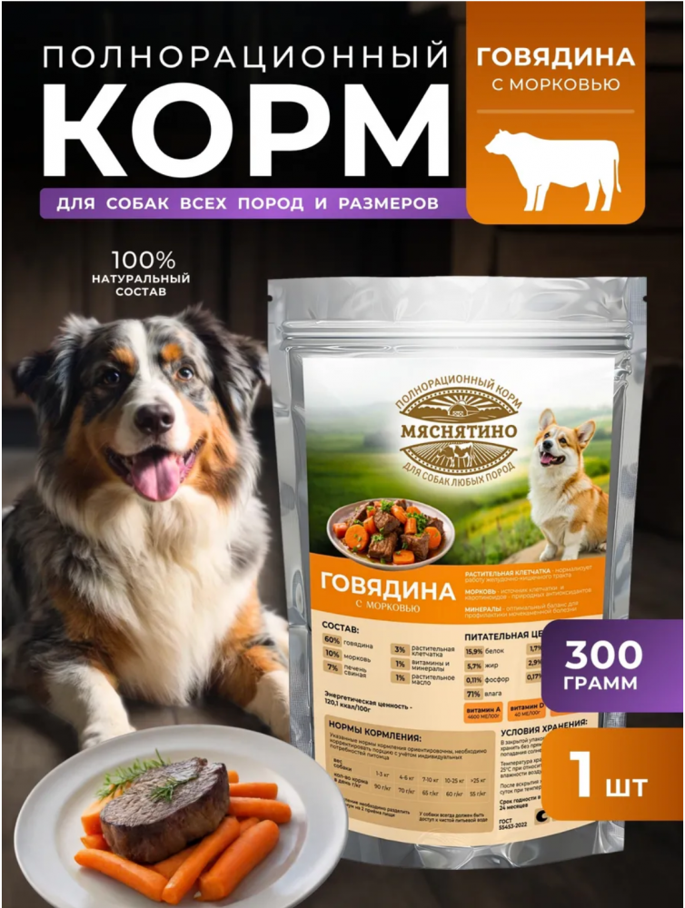 Полнорационный влажный корм "Мяснятино" для собак на основе говядины — это продуманное питание, созданное для здоровья, энергии и отличного самочувствия вашего питомца каждый день. Рецептура разработана так, чтобы собака получала полноценный рацион, обеспечивающий организм всеми необходимыми веществами. КБЖУ на 100 г: Энергия: 120 ккал Белок: 15,9 г | Жиры: 5,7 г | Углеводы: 0,3 г Клетчатка: 1,7 г | Влажность: 71% | Зола: 2,9% Ключевые преимущества и особенности состава: 60% говядины. Высокое содержание качественного мяса обеспечивает собаку необходимыми белками и аминокислотами. Это способствует крепкой мускулатуре, даёт энергию для активной жизни и поддерживает здоровый обмен веществ. Естественная влажность корма. Помогает решить проблему недостаточного потребления воды, что актуально для многих собак. Регулярное кормление влажным кормом поддерживает нормальную работу мочевыделительной системы. Натуральные и функциональные добавки. Свиная печень (7%) — природный усилитель вкуса, который делает корм особенно привлекательным для животных. Также это источник железа и витаминов. Морковь (10%) — содержит клетчатку для здорового пищеварения и бета-каротин, полезный для зрения и иммунитета. Полный набор питательных веществ. В состав включены растительная клетчатка (3%) для комфортного пищеварения, витаминно-минеральный комплекс (1%) для крепкого иммунитета и здоровья костей, а также растительное масло (1%) для блестящей шерсти и здоровой кожи. Почему этот корм — удобное решение для владельца собаки? Польза для питомца: сбалансированное питание, которое решает ключевые задачи — дает энергию, поддерживает гидратацию организма и здоровье внутренних систем. Высокая вкусовая привлекательность: насыщенный мясной вкус и аромат нравятся собакам, что особенно важно для привередливых едоков. Удобство использования: готовое к употреблению питание, которое не требует приготовления. Корм можно давать как отдельно, так и в смеси с сухими гранулами для разнообразия рациона. Подробнее