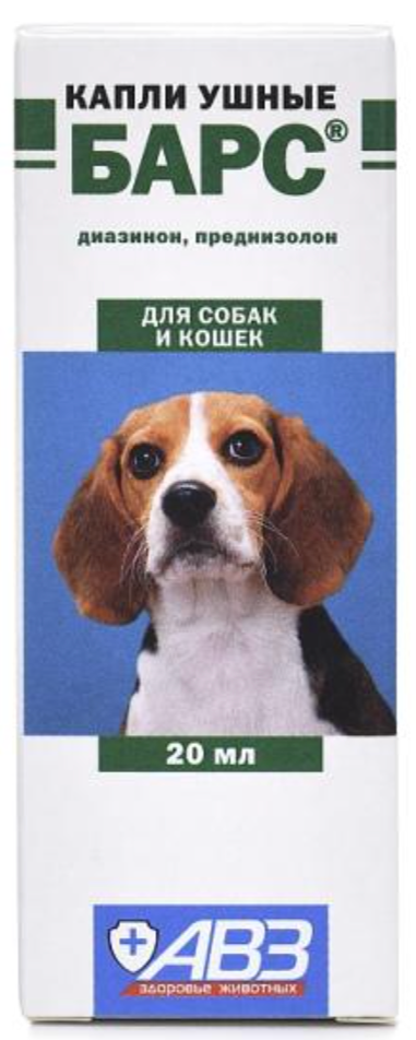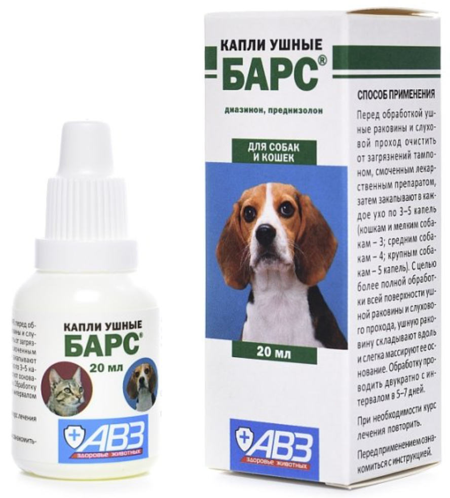 Показания к применению. Отодектоз (ушная чесотка) собак и кошек. Противопоказания. Повышенная индивидуальная чувствительность к диазинону. Побочные явления. При применении препарата согласно инструкции побочных явлений и осложнений не наблюдается. Дозы и способ применения. Ушную раковину и слуховой проход очищают от струпьев и загрязнений тампоном, смоченным препаратом, а затем закапывают неглубоко в каждое ухо: кошкам и мелким собакам – 3 капли препарата, средним собакам – 4, крупным – 5 капель. С целью более полной обработки всей поверхности ушной раковины и слухового прохода, ушную раковину складывают вдоль и слегка массируют ее основание. Обработку проводят двукратно с 5–7-дневным интервалом. При необходимости лечение повторяют. Капли обязательно вводят в оба уха, даже в случаях поражения отодектозом только одного. Особые указания. После манипуляций с препаратом тщательно вымыть руки с мылом. При попадании капель «Барс» на кожу или слизистые оболочки человека, препарат следует смыть струей воды или снять тампоном. Состав и фармакологические свойства. Препарат активен в отношении саркоптоидных клещей – возбудителей отодектоза кошек и собак. Входящие в состав капель активные компоненты обладают акарицидным, бактерицидным, противовоспалительным действием, ускоряют процесс эпителизации. Форма выпуска. Полимерный флакон-капельница 20 мл. Внешняя упаковка – картонная коробка. Подробнее