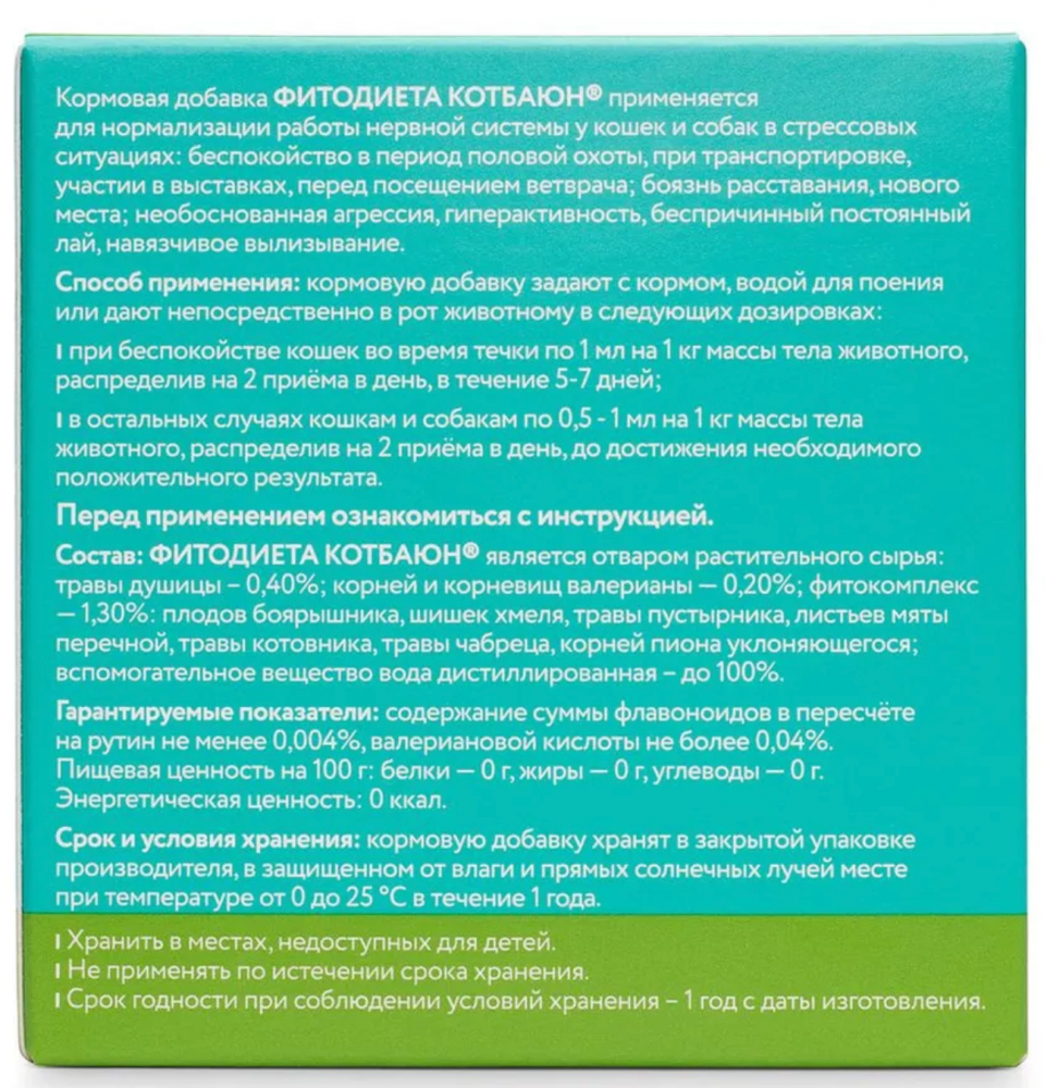 Кот Баюн® - лекарственное средство в форме стерильного водного настоя лекарственных растений: травы душицы – 0,45%, травы донника – 0,23%, корневища с корнями валерианы – 0,23%; цветов и плодов боярышника, шишек хмеля, травы пустырника, листьев мяты перечной, травы будры плющевидной, травы котовника, травы мелиссы, цветов таволги вязолистной, травы зверобоя, травы чабреца, травы сушеницы топяной, травы солянки холмовой, листа крапивы, корней пиона уклоняющегося – 1,45% и воды дистиллированной - до 100%.