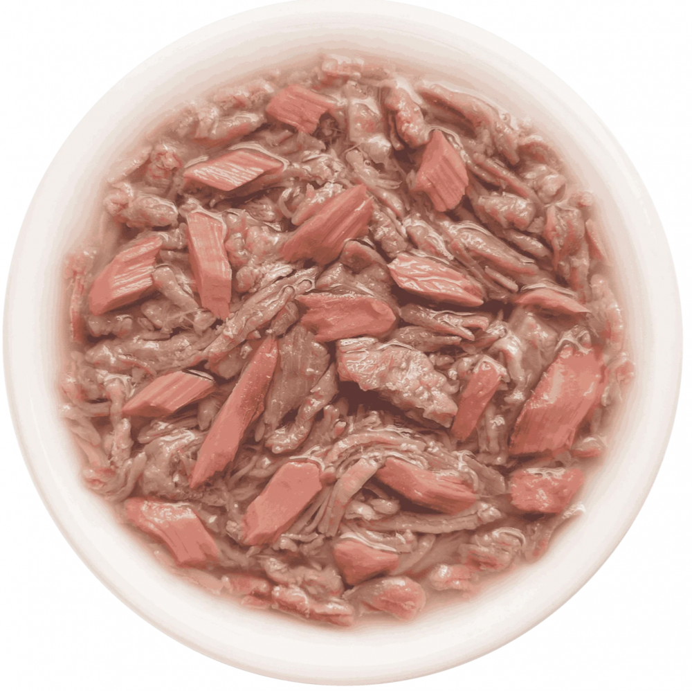 Состав: утка 54 %, тунец 6 %, бульон из утки 38 %, натуральная желирующая добавка.nПищевые добавки: пивные дрожжи (источник пребиотика МОС), пребиотик ФОС, рыбий жир (анчоус), витамин Е, таурин, минералы.nПищевая ценность, %: протеин — 11, жиры — 2, клетчатка — 1, зола — 1,5, влажность — 89; энергетическая ценность — 55 ккал.