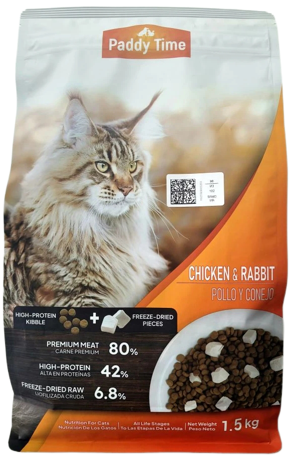 Корм Paddy Time беззерновой: 2 вида гранул- Кролик с сублимированным мясом курицы для кошек 1,5 кг