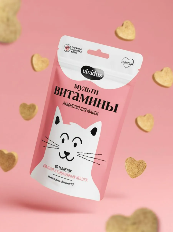 Новинка от бренда Vividus — специальное лакомство, обогащенное комплексом витаминов и минералов для поддержания здоровья котят и беременных кошек. Каждая таблетка содержит ключевые нутриенты, необходимые для гармоничного развития и укрепления организма в важные периоды жизни. Мультивитаминное лакомство - отличный источник дополнительных полезных веществ и незаменимая добавка к основному рациону животного. Кальций и фосфор способствуют формированию и укреплению костной системы. Гемоглобин нормализует функцию кроветворения. Витамин Д3 участвует в регуляции кальций-фосфорного обмена, способствует минерализации костей и зубов и формированию здорового костяка. Универсальность Легко сочетается с любым типом кормления — натуральным рационом, сухими или влажными кормами. Базовая норма — 5−6 таблеток в день. Дозу можно увеличить в 1,5−2 раза в периоды повышенных нагрузок, стресса, болезни или реабилитации, что делает добавку гибкой и отвечающей потребностям питомца. Специализированная формула Разработана с учетом повышенных потребностей в питательных веществах у котят и беременных/лактирующих кошек. Комплекс гемоглобина, кальция, фосфора и витамина D3 целенаправленно поддерживает: Нормальное кроветворение и снабжение кислородом. Формирование крепкого костяка и зубов. Здоровый кальций-фосфорный обмен. Натуральная основа • Содержит полезные ингредиенты — пивные дрожжи, молочную сыворотку, сухое молоко, лимонный сок, витамины группы B и C. • Соответствие стандартам: • Продукт сертифицирован и соответствует требованиям безопасности и качества. • Длительный срок хранения: 24 месяца при соблюдении простых условий (сухое, темное место). Формат полезного лакомства Таблетированная форма воспринимается кошками как вкусное поощрение, что упрощает регулярный прием без стресса. Выгодный объем: Упаковка содержит 90 таблеток, что обеспечивает длительный курс приема. Подробнее