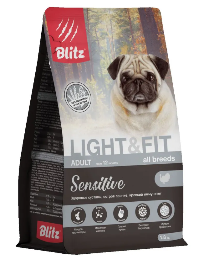 На сегодня избыточный вес является одной из самых частых проблем среди домашних животных. Недостаточная активность, сбои в режиме питания, породная предрасположенность — всё это влияет на набор лишних килограммов. Сбросить их не так легко, но крайне желательно, если вы хотите, чтобы ваш питомец был здоров и долго жил полноценной жизнью. Помочь в этом может специализированный корм — предназначенный именно для собак с лишним весом. Почему мы рекомендуем использовать рацион Blitz Sensitive Light Adult Dog All Breeds? Характеристики корма «Блиц Лайт» для собак с лишним весом Прежде всего, сухой корм Blitz Light & Fit содержит всего 380 ккал / на 100 г, что на 7–8% ниже привычных показателей кормов для взрослых собак. Меньшая калорийность достигается за счёт снижения жирности, а вот объём протеина и других питательных веществ остаётся на прежнем, высоком уровне. Натуральное мясо индейки, цельные злаки (рис и ячмень), полезная клетчатка и добавки для активации метаболизма — те преимущества, которые характеризуют корм Blitz Sensitive Light & Fit Adult Dog и делают его прекрасным вариантом для питания собак с лишним весом. Полезные добавки У животных, ведущих малоподвижный образ жизни, часто бывает слабая моторика кишечника. Усилить её призваны входящие в состав рациона компоненты: свекольная пульпа, пребиотики, экстракт фенхеля, фукуса и полезные кишечные бактерии. А дополнительный комплекс из трёх аминокислот: карнитина, лизина и метионина будет способствовать снижению веса животных без потери мышечной массы, за счёт быстрого расщепления жиров и превращения их в энергию. Корм Blitz Sensitive Light & Fit Adult Dog All Breeds имеет гранулы среднего размера и подходит для собак всех пород. Переходить на него мы советуем постепенно, в течение 7-10 дней, ежедневно заменяя небольшую часть привычного корма новым. Также очень важно соблюдать нормы кормления, указанные в нашей таблице — только тогда вы получите видимый результат. Пусть ваш питомец будет здоров, строен и подвижен! Состав Дегидрированное мясо индейки (32%), цельный ячмень, цельный рис, свекольная пульпа, жир куриный, масло из кукурузного зародыша, гидролизованные мясные продукты, дрожжи (источник MOS), жир рыбий, дегидратированное яйцо, плазма крови, D,L-Methionine, комплекс витаминов и минералов (витамины: А, D3, Е, холин хлорид, бетаин, В3, В5, В2, В1, В6, фолиевая кислота, В12, калий, цинк, железо, марганец, медь, йод, селен), масляная кислота (бутилин 54), L-Lysine, антиоксидант, L-Carnitin, глюкозамина гидрохлорид, экстракт цветков бархатца (источник лютеина), ксилоолигосахариды (пребиотики), комплекс пробиотиков - живые микроорганизмы Bacillus subtilis и Bacillus licheniformis, хондроитина сульфат, экстракт юкки Шидигера, экстракт розмарина, экстракт фенхеля, экстракт фукуса. Подробнее